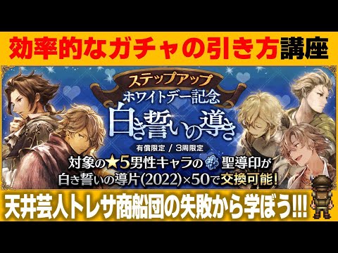 現在開催中の白き誓いの導き、とってもお得なガチャなので個人的にはおすすめですが本当に効率的なガチャの引き方は何なのかということを4年間の失敗から導いたトレサ商船団理論にもとづいて解説します🤣